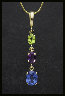Graduated 3 Stone Pendant Shown with Peridot, Amethyst and Spinel Available in 14kt Yellow or White Gold and Sterling Silver Available in Most Stones and Combinations |